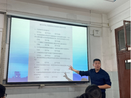 之后,许老师通过提问了解学生对艾滋病的知识的知晓率,并向同学们做了艾滋病知识的普及。艾滋病并不会通过接触、眼泪、汗液或唾液传染,正确了解传播途径,可以有效预防感染;患有性病后也应及时、积极地进行治疗。