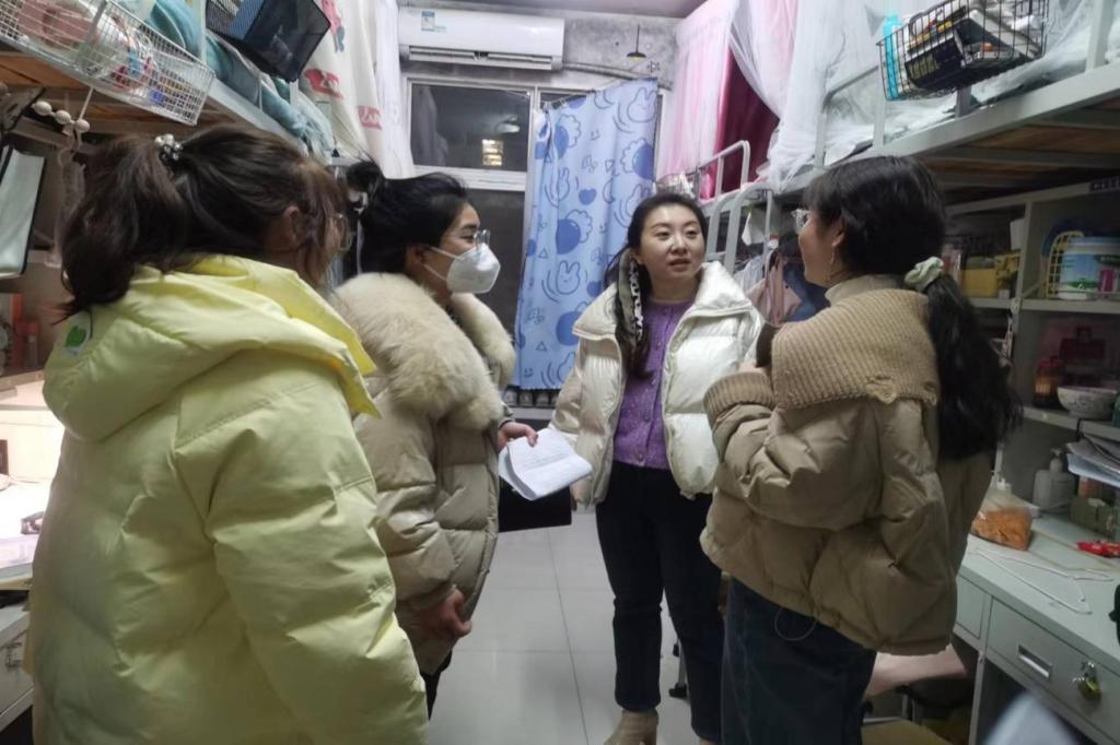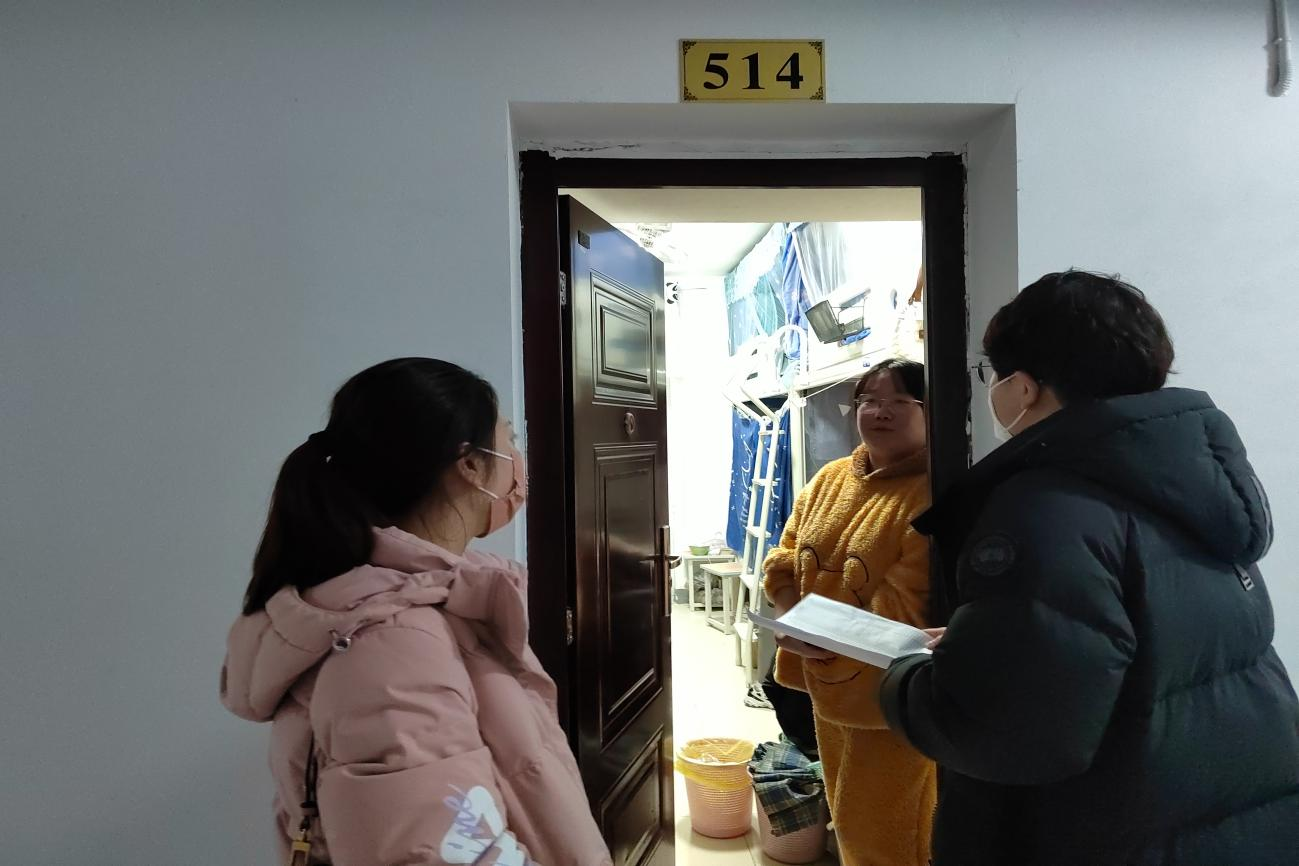 江岚、孙笛一行前往二期E栋走访24个女生寝室。在交流时,两位老师主要与学生交流寒假返校情况、分享假期生活等,并对毕业班的学生进行了较为深入的沟通,对毕业后不同选择的同学提出针对性建议,提醒做好毕业就业规划。