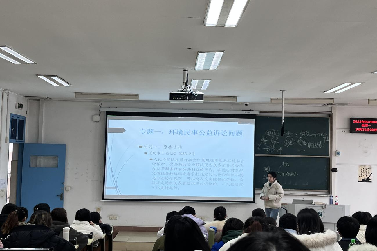 领导、教师和2020级的法学专业的同学们早早来到教室落座,随着上课铃响起,郑老师带领大家进入环境法案例研习课程的导学环节,强调多法律部门视角审视环境问题的重要性;通过解析指导性案例以及相关法律规定,引导学生注重利用法律解决环境焦点问题;论证了我国当前的环境公益诉讼的结构和程序合理化变化,强调了环境保护职能部门和司法机关的区别,不同机关在处理环境问题中的作用不同。yl6809永利集团的学生们在整堂课中聚精会神,积极回答老师的问题,展现了yl6809永利集团学子求知若渴的状态和昂扬精神。