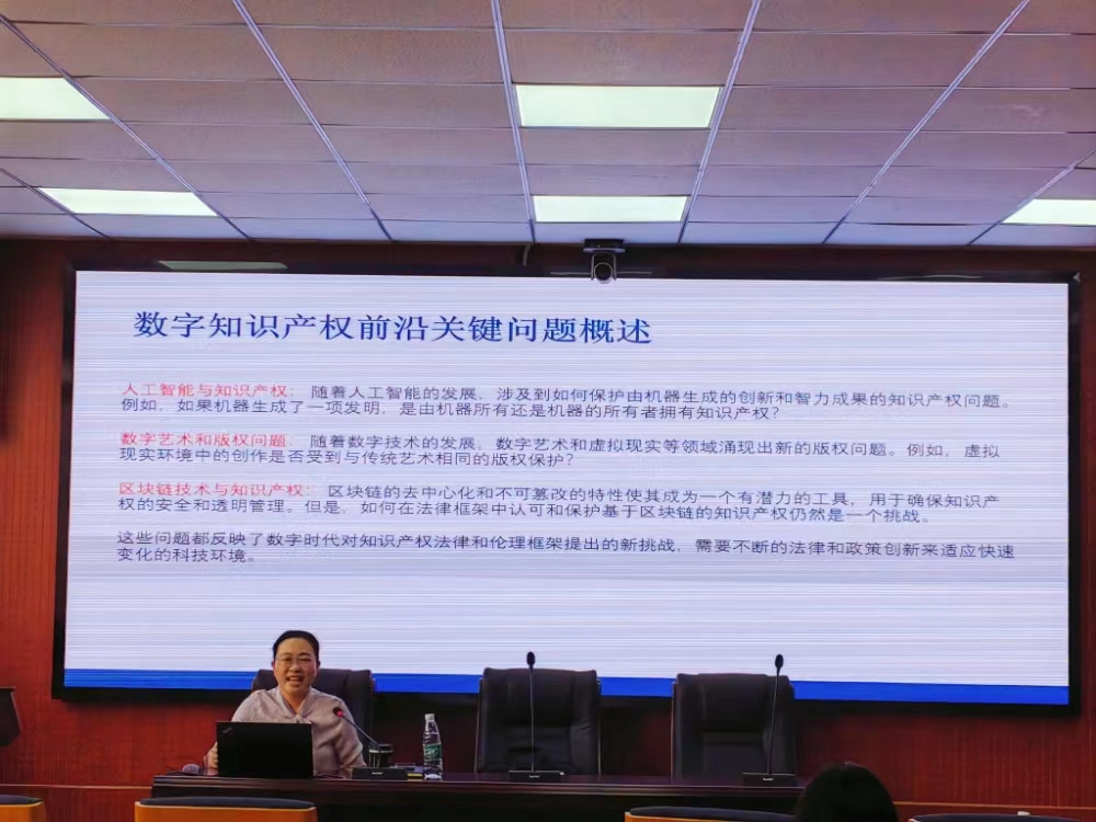 随后,温珊姗律师围绕“人工智能与知识产权”、“数字艺术与版权”、“区块链技术与专利”等数字知产前沿问题进行了主题分享,其不仅介绍了人工智能与区块链领域中最新的知识产权产业发展数据,还着重从专利的角度分析了人工智能生成内容的可专利性以及区块链专利侵权问题。此外,作为拥有专利代理人资格和律师资格的双证律师,温律师还向同学们分享了成为双证律师的成长路径与心得。