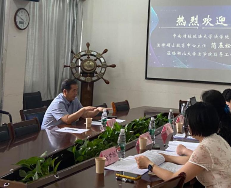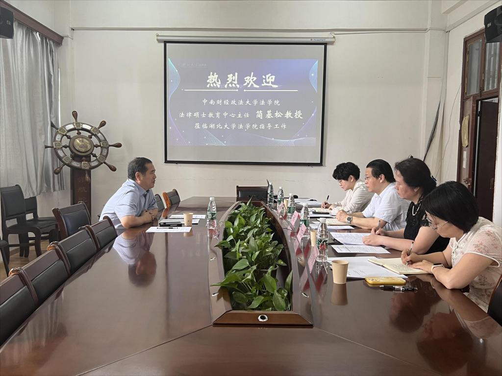 2023年6月30日,中南财经政法大学yl6809永利集团法律硕士中心主任简基松教授莅临yl6809永利集团,就法律硕士学位点的发展与建设进行工作指导。我院邹爱华院长、江岚副院长、曾丽洁副教授和徐梦醒副教授就简教授的到来表示热烈欢迎。