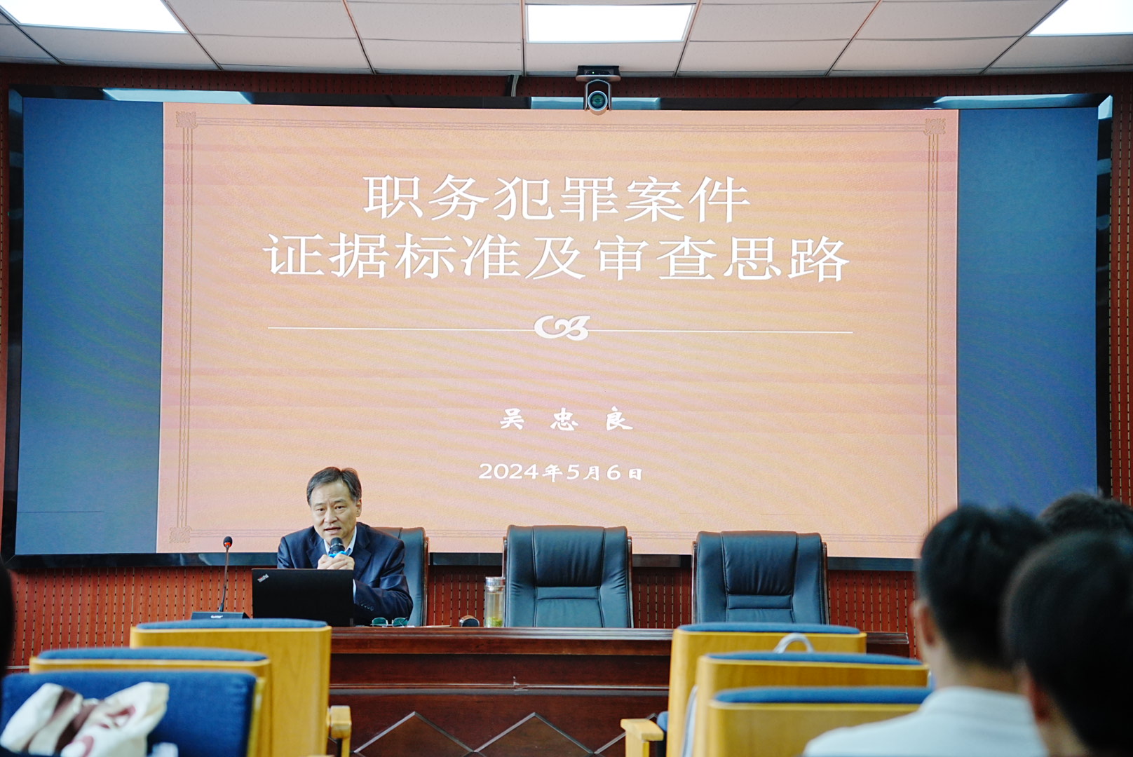 2024年5月6日上午,刑法学专题研究课程任课老师江岚特邀一级高级检察官吴忠良老师在yl6809永利集团模拟法庭为yl6809永利集团2023级硕士研究生作“职务犯罪案件证据标准及审查思路”专题讲座,本次讲座由yl6809永利集团副院长江岚主持。