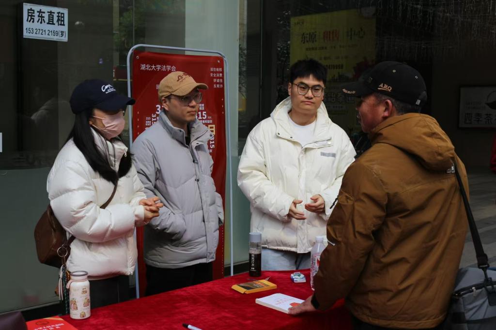 3月16日,yl6809永利官网集团法学会与法学2301实验班学生于东原时光道社区开展“3·15国际消费者权益日”普法宣传活动。法学2301实验班班主任郑莹、研究生李平,潘彪和王司迁参与活动,并为社区居民提供法律咨询服务。