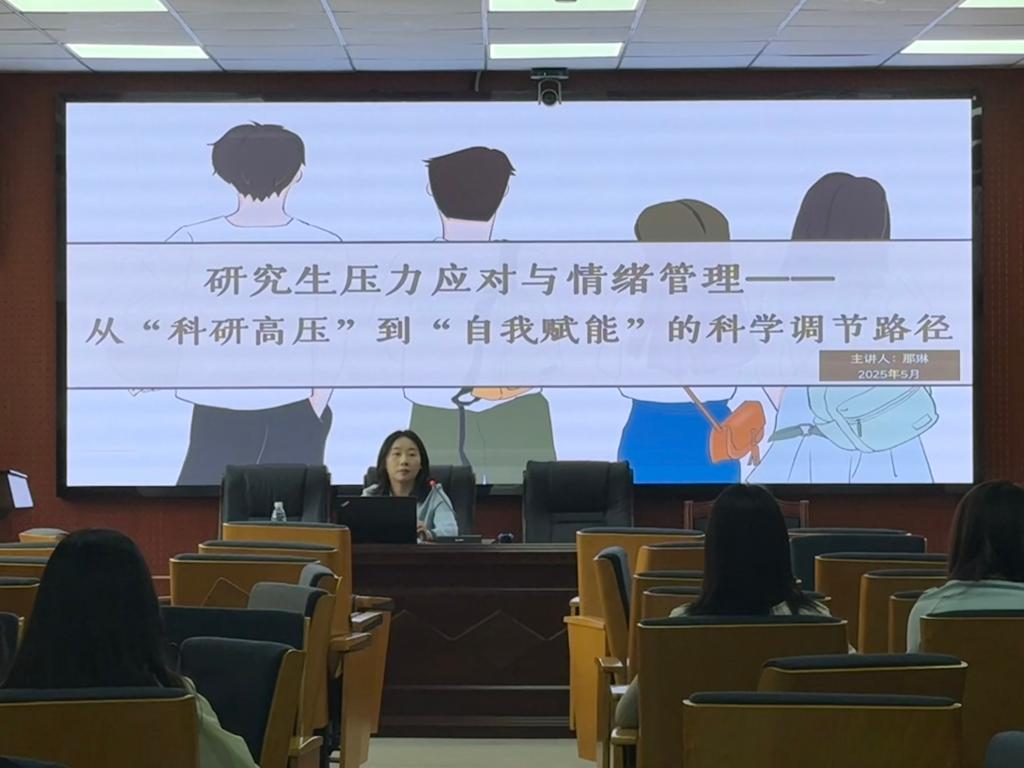 讲座中,那琳老师结合心理学理论与实际案例,深入剖析了研究生群体面临的主要压力源并提出“自我赋能”的科学调节路径。高校应加强“导学共同体”建设,通过心理健康课程、团体活动等方式,帮助学生提升心理韧性。