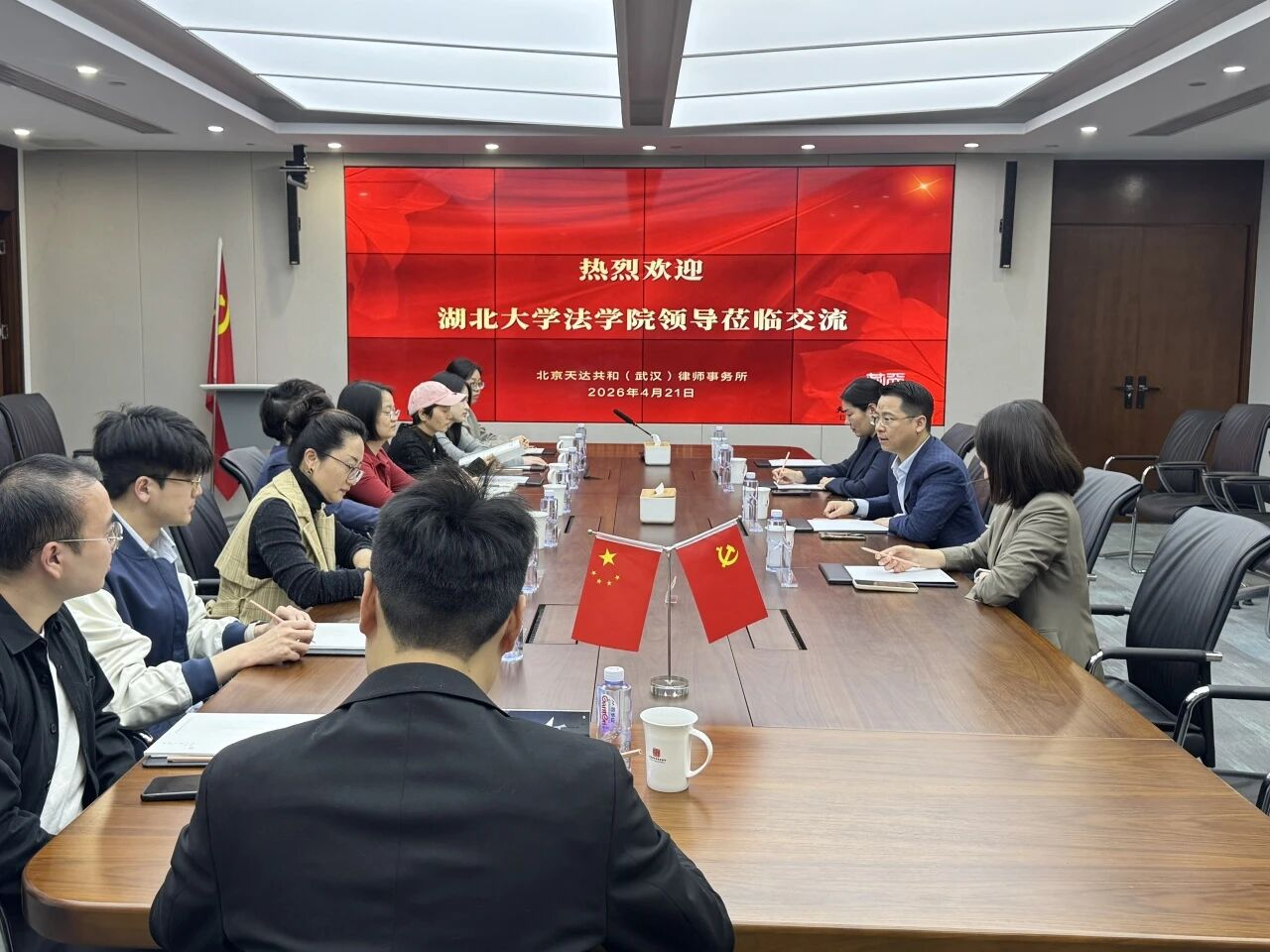2026年4月21日上午,yl6809永利集团副院长江岚、副院长徐梦醒、副教授张颖、研究生办秘书张素华及研究生南可欣、宁彦博、王思睿、潘彪、王司迁一行赴天达共和律师事务所武汉办公室座谈交流。武汉办管委会主任杨斌、管理合伙人彭夫、合伙人向甜、鄢灵热情接待。