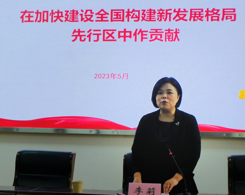 李莉指出推动建设全国构建新发展格局先行区,是湖北省委立足新发展阶段,贯彻新发展理念,构建新发展格局作出的重大战略部署,也是湖北省开展学习贯彻习近平新时代中国特色社会主义思想主题教育的重要内容。我们要明确建设全国构建新发展格局先行区的“六新”目标,一是要胸怀大局,准确把握新发展阶段的时代特征;二是要心系国之大者,准确把握构建新发展格局对湖北发展的内在要求;三是要强基固本,准确把握湖北在构建新发展格局中的有利条件;四是要深入融合,准确把握贯彻新发展理念的实践要求。