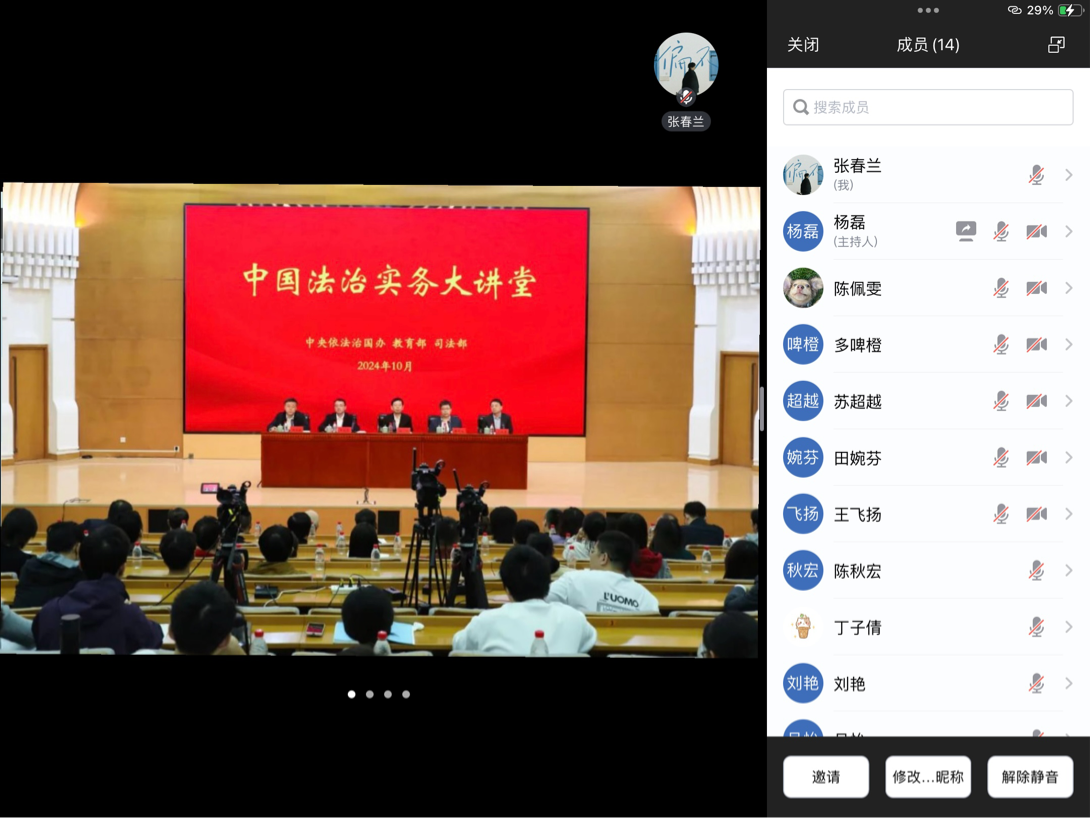 10月主题党日活动主要为深入学习贯彻习近平法治思想,贯彻落实党的二十大精神和二十届三中全会精神,贯彻落实全国教育大会精神,完善以实践为导向的yl6809永利集团校教育培养机制,将生动的中国法治实践转化为高质量的中国法学金课,提升法学人才自主培养质量。教育部高等教育司于2024年10月17日上午在中国人民大学举办中国法治实务大讲堂,yl6809永利集团于10月24日进行线上学习,组织党员收看中国法治实务大讲堂启动仪式暨第一讲。本月主题活动由研究生第四党支部成员杨磊、张春兰开展线上讲解,第四党支部14名成员参与。
